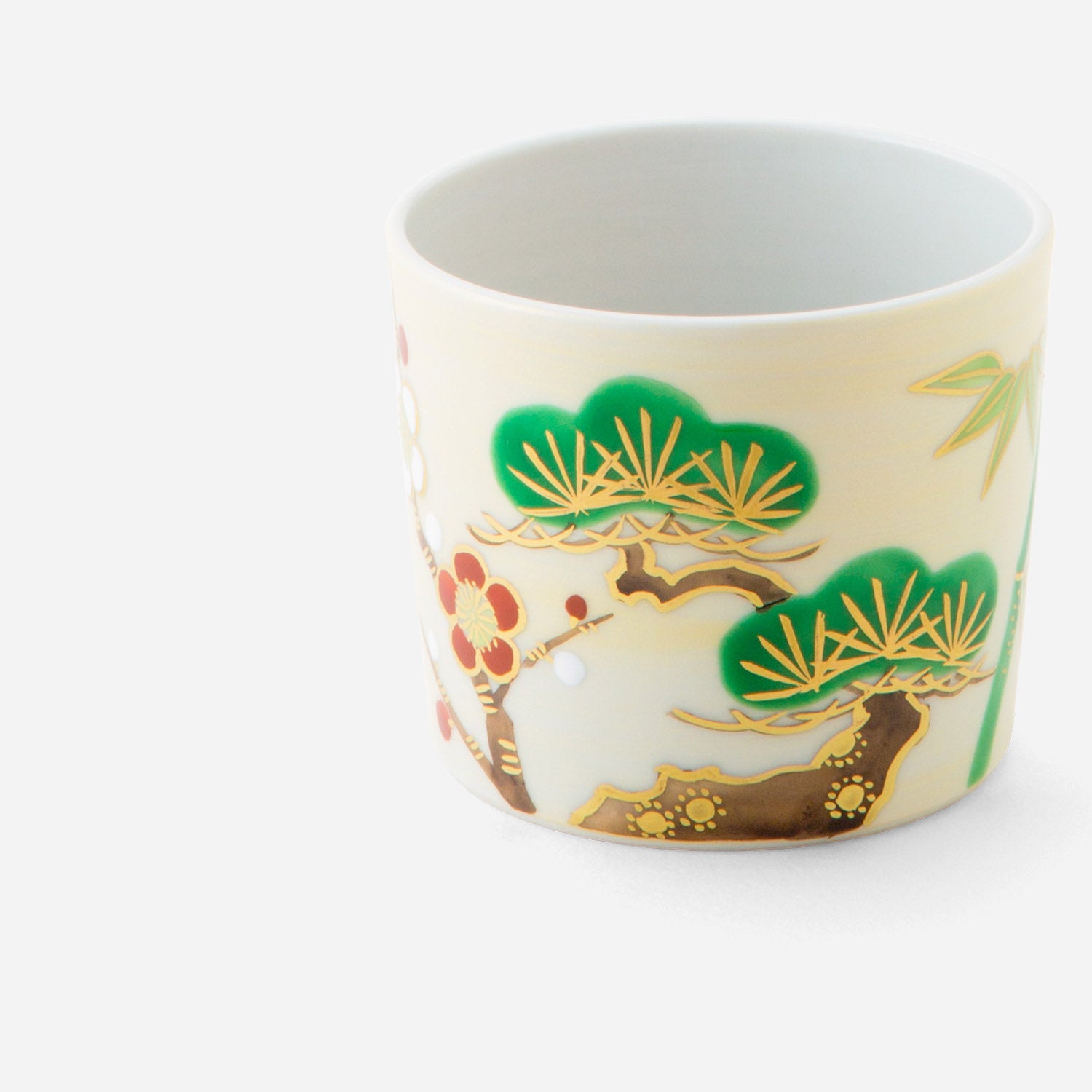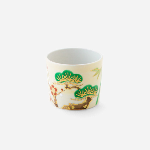 Artisanal Japanese Sake Cup - Golden Pine, Bamboo, and Plum Blossom Design