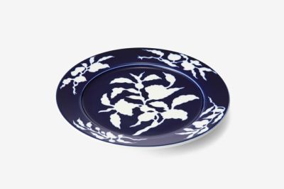 - Striking midnight blue glaze with elegant white floral resist pattern
