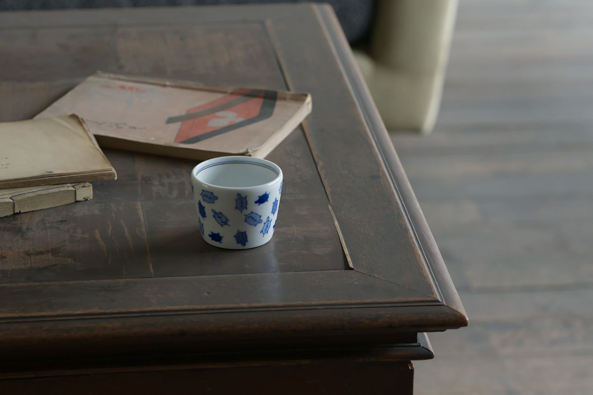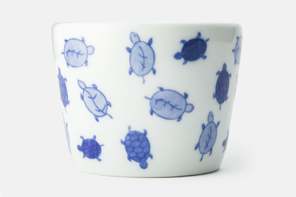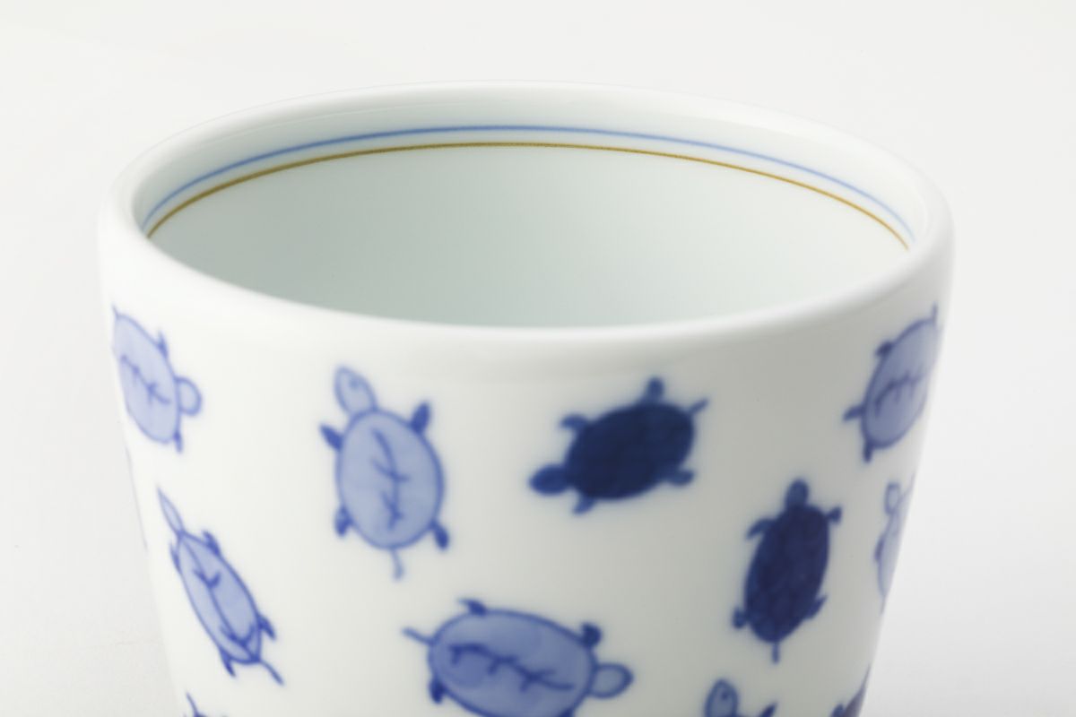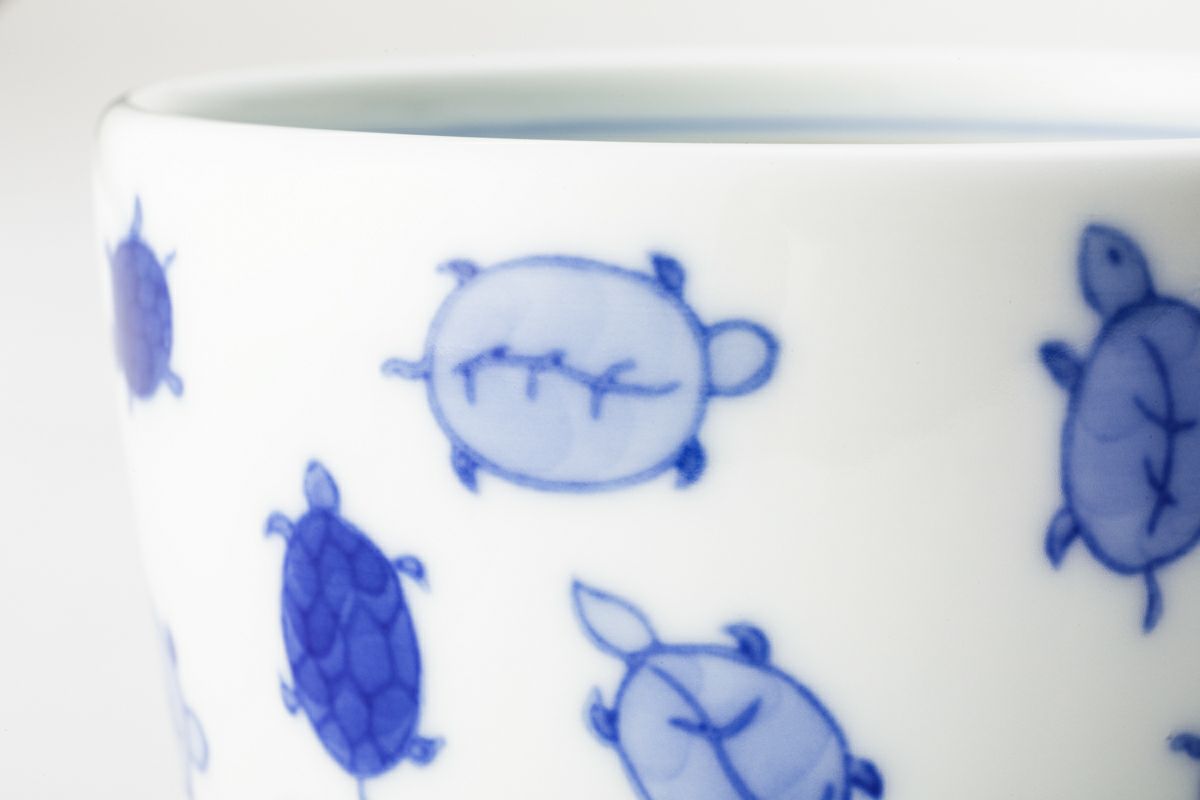 Crafted using the sometsuke (blue and white) technique, a hallmark of traditional Japanese ceramics, each turtle is hand-painted with care. The varying shades of blue create depth and movement, bringing the design to life. A thin blue line encircles the rim of the cup, adding a subtle finishing touch to the overall design.