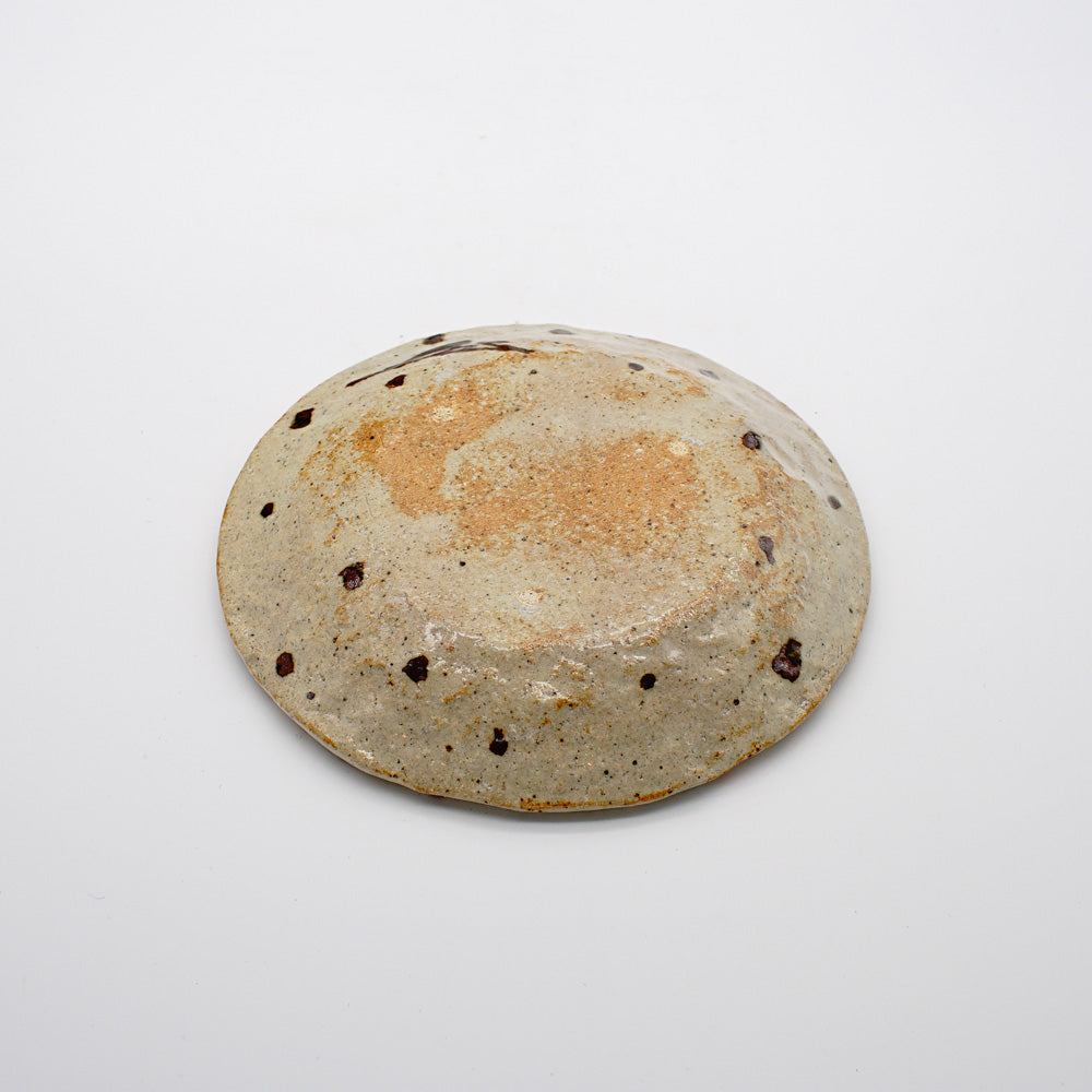 Small, seemingly random spots and marks in dark brown glaze are scattered across the plate's surface, reminiscent of pebbles or sand on a beach. These details add depth and character to the overall design, enhancing its organic, handcrafted appeal.