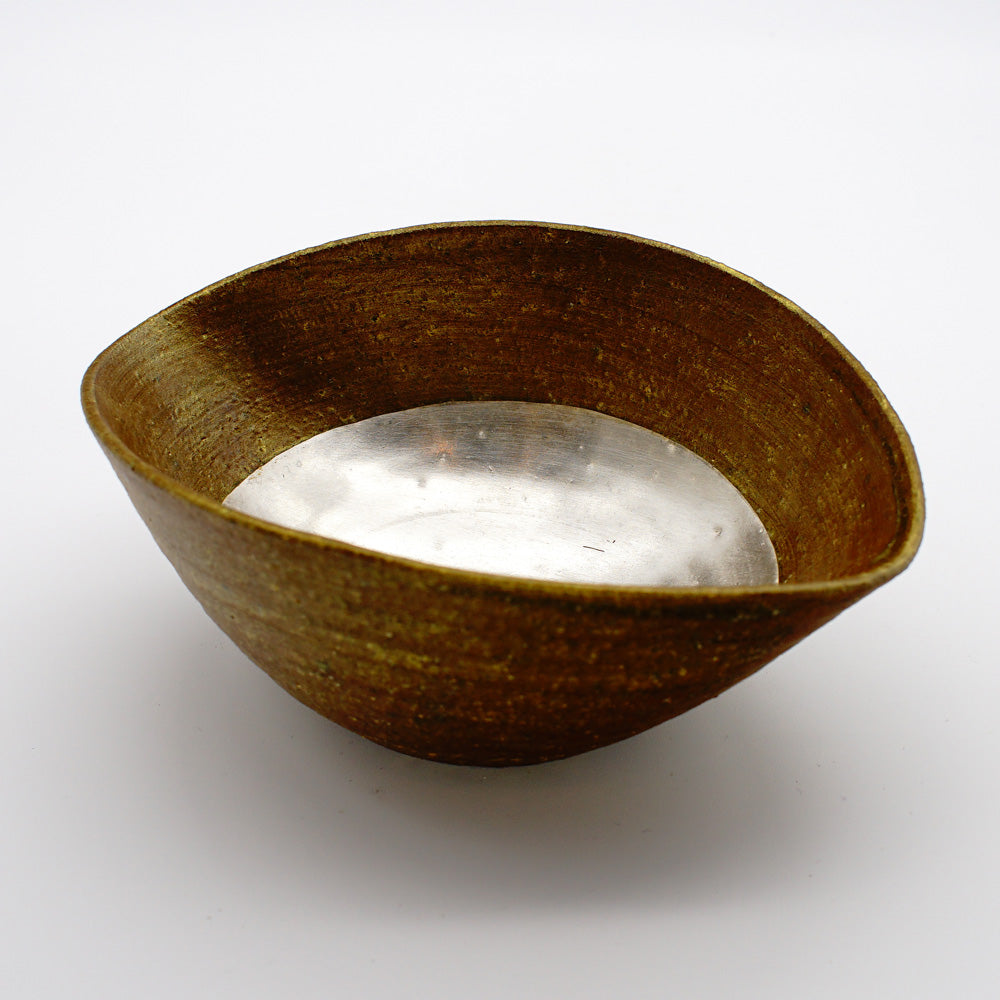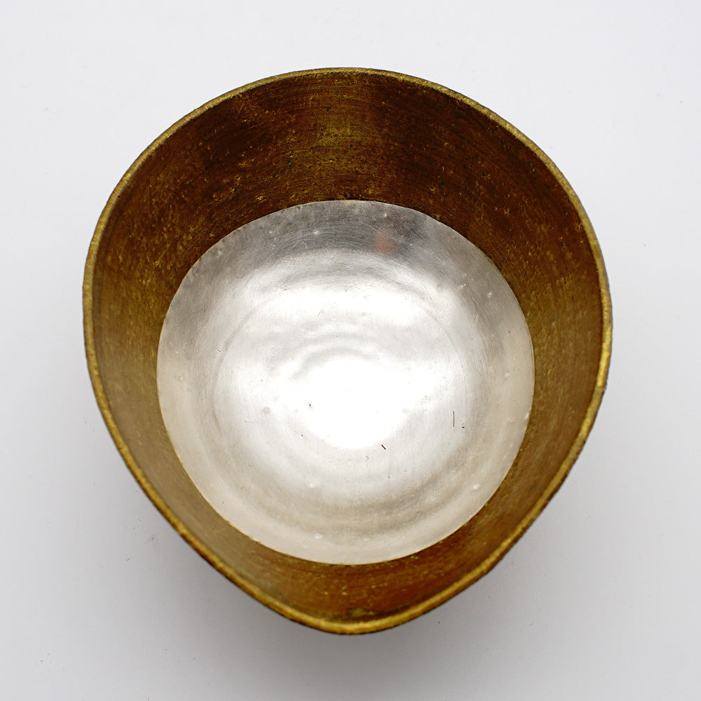 In striking contrast, the interior of the bowl features a lustrous silver finish. This silver surface is smooth and reflective, reminiscent of a calm pond or a mirror-like expanse. The interplay between the golden exterior and silver interior creates a captivating visual effect, symbolizing the meeting of earth and sky or the transition from day to night.