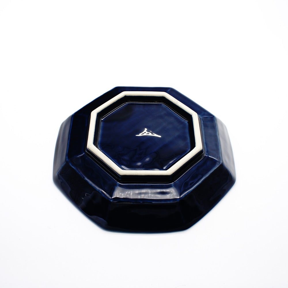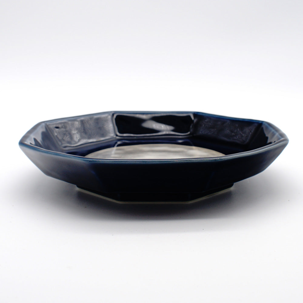 This 17cm wide and 3.5cm deep plate features a captivating octagonal shape, symbolizing good fortune in Japanese culture. The deep, lustrous midnight blue glaze on the outer rim and sides creates a striking contrast with the central circular area, which showcases a delicate silver lustre finish reminiscent of a full moon.