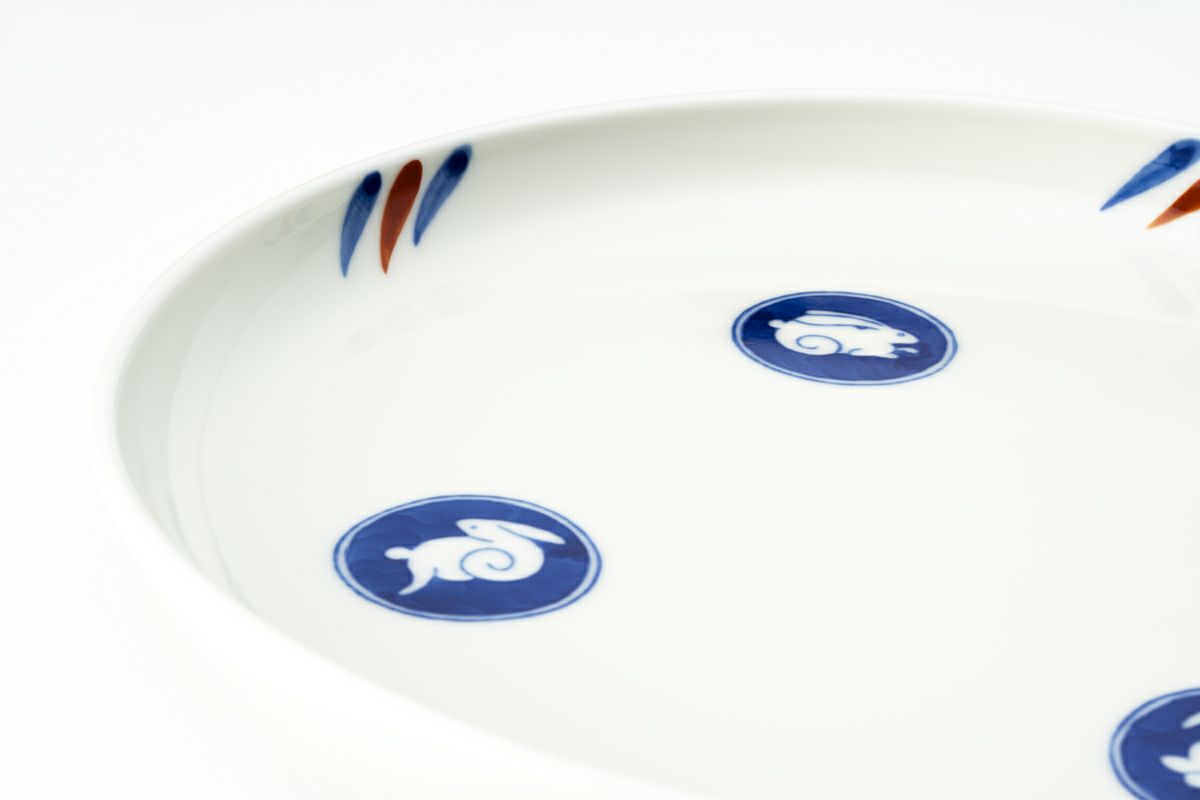 The plate's design showcases three charming blue circular motifs, each containing a stylized white rabbit. These rabbits, known as "tsuki mi usagi" or moon-viewing rabbits, are a popular and auspicious symbol in Japanese culture. The circular designs are reminiscent of full moons, enhancing the theme of moon-viewing.