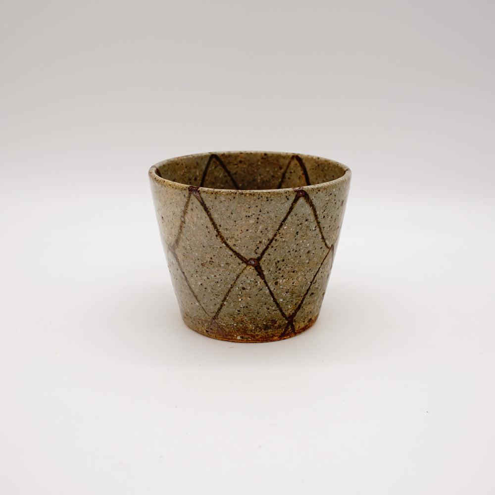 Crafted by skilled artisans, this yunomi features a muted, earthy glaze that serves as the perfect backdrop for the bold soba-ami pattern. The diamond-shaped grid is carefully etched into the surface, creating a tactile and visual experience that enhances your tea-drinking ritual.
