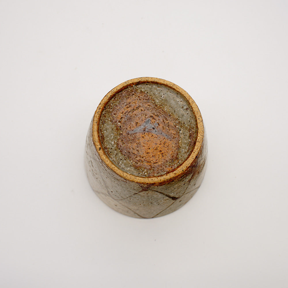 The cup's rustic appearance is characterized by its slightly irregular shape and the natural variations in the glaze, embodying the wabi-sabi aesthetic that celebrates imperfection and transience. These subtle irregularities make each cup a unique piece of art.