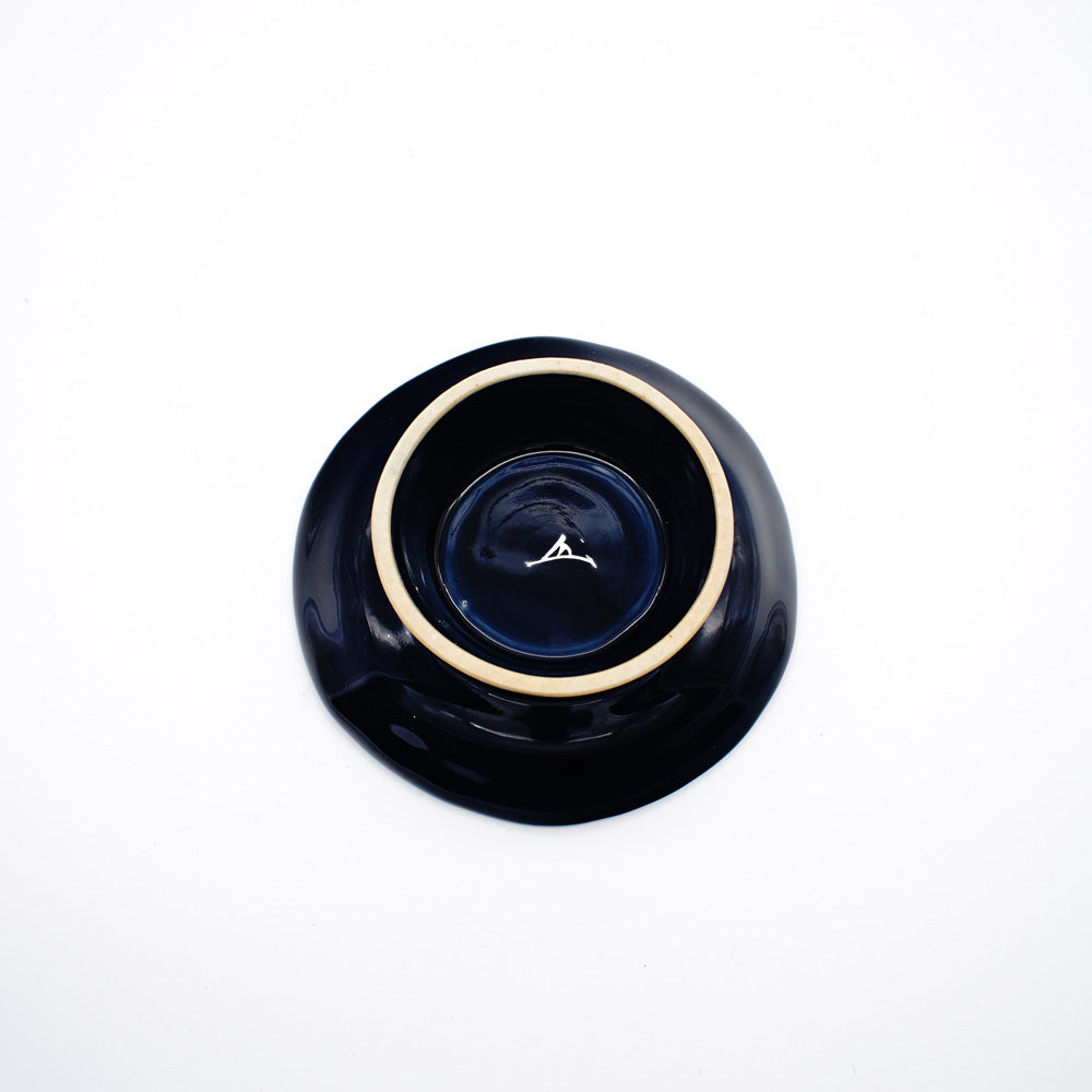 Measuring 10.5cm in diameter and 3.5cm in height, this petite pedestal plate features a stunning deep sapphire blue glaze that covers the majority of its surface. The raised foot adds a touch of elegance and makes it easy to hold and present.