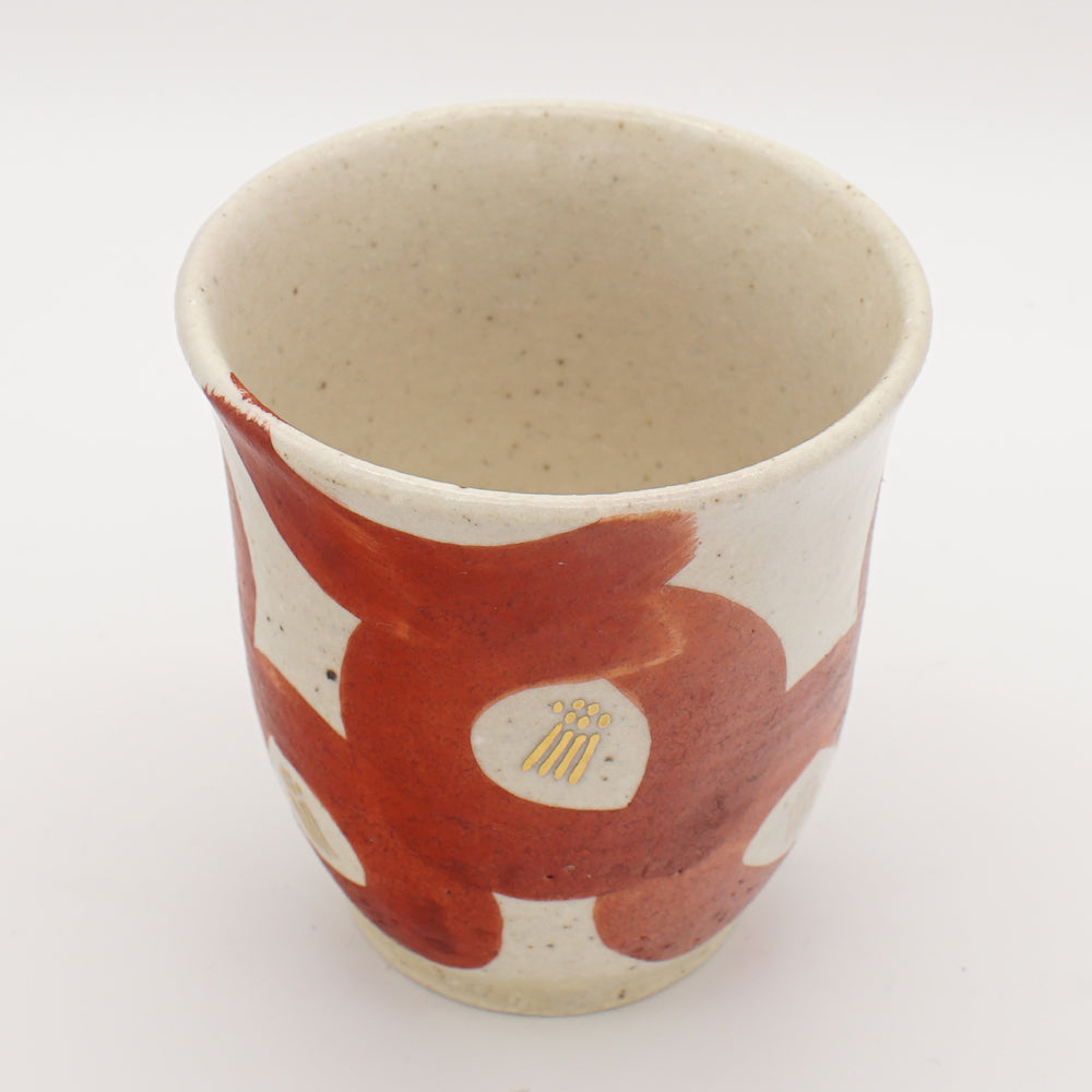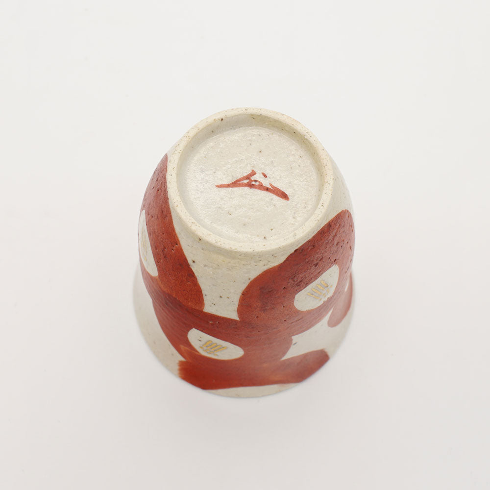 The cup features a striking design of bold, flowing crimson brushstrokes against a creamy white background, reminiscent of the petals of a camellia flower. This dynamic pattern, executed in the Shino style, creates a sense of movement and organic beauty around the cup. Within the red areas, small golden details are delicately painted, adding depth and a touch of elegance to the design.